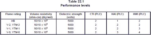Eine der wichtigsten Tabellen in dieser Norm (Table 22.1) fasst die Anforderungen in Bezug auf die Performance-Levels der verwendeten Isolationsmaterialien zusammen, die direkten Kontakt zu stromführenden Teilen haben.